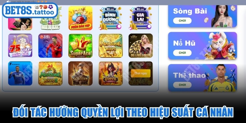 Lợi ích khi làm đại lý BET8S là mức hoa hồng thuộc top đầu thị trường, đôi khi lên tới 50% hoặc cao hơn tùy theo năng lực. Bạn sẽ được cấp quyền truy cập vào bộ công cụ quảng cáo chuyên nghiệp, bao gồm hình ảnh, banner và các đường link track riêng biệt để quản lý khách hàng dễ dàng. Bên cạnh đó, đối tác còn được đào tạo bài bản về kỹ năng SEO, chạy quảng cáo và quản trị website hoàn toàn miễn phí.